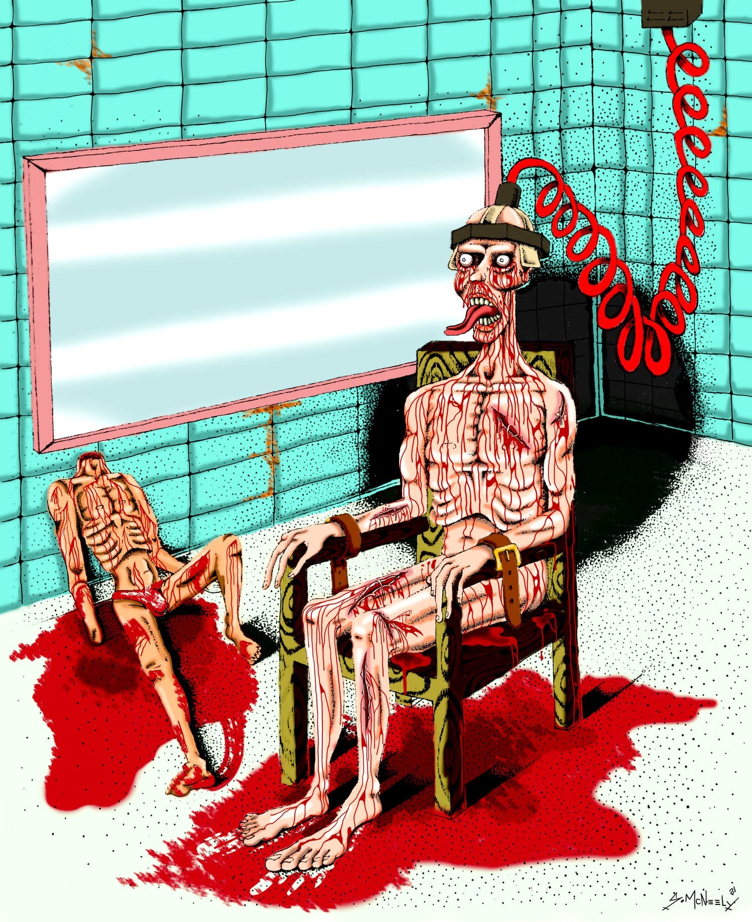 My process varies because no two jobs are alike. For this design I decided ahuman torso would look awesome for the front of the jersey. For the back I saidto myself well you can’t forget the severed head accompanied by a maggot colony to form the logo. I did a rough sketch and once the overall design was approved I made a dark outline and added some fine details. After that I nailed the coffin shut with some bright red blood and pinkish flesh to complete the colouring.
